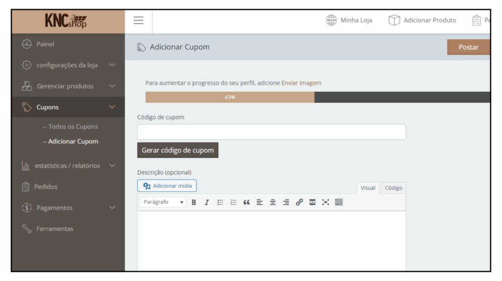 O KNCShop permite que o vendedor crie cupons de desconto para seus clientes. Essa ferramenta é opcional, mas muito útil para ações promocionais, divulgação da loja nas redes sociais, fidelização de clientes e aumento das vendas.