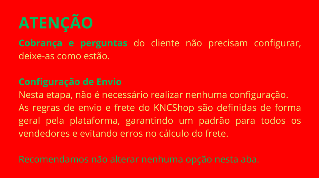 Algumas opções do painel já vêm configuradas automaticamente pelo KNCShop. Campos relacionados a permissões, estrutura técnica ou integrações da plataforma não precisam ser alterados.
