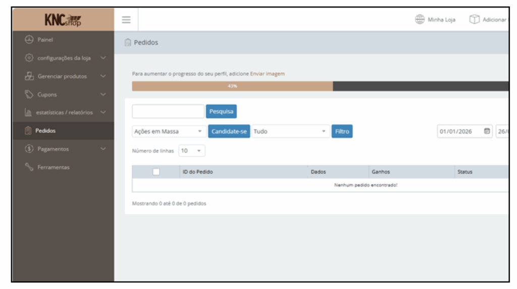 O menu Pedidos é o local onde o vendedor acompanha todas as compras realizadas na sua loja dentro do KNCShop. É por meio dessa área que você visualiza novos pedidos, confere informações do cliente e acompanha o andamento das vendas.