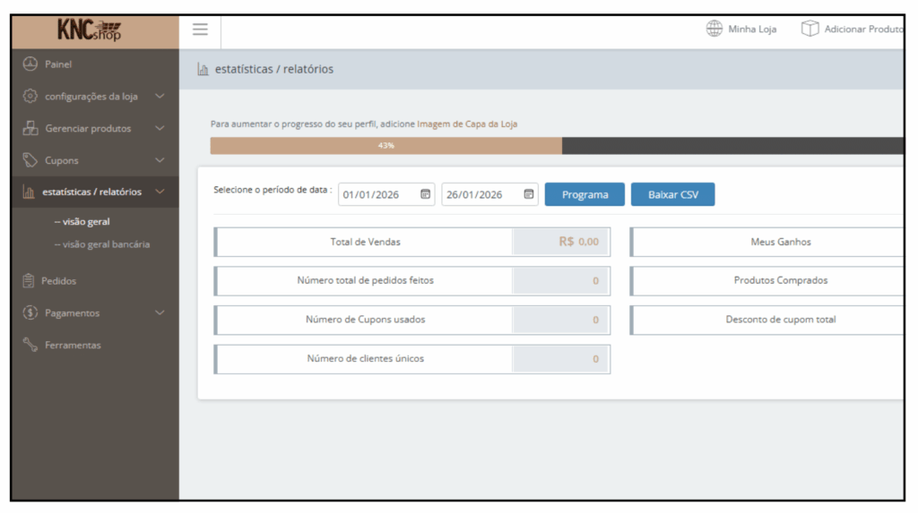 A área de Estatísticas e Relatórios do KNCShop permite que o vendedor acompanhe o desempenho da sua loja de forma clara e organizada. Esses dados ajudam a entender as vendas, identificar períodos de maior movimento e ter mais controle financeiro.